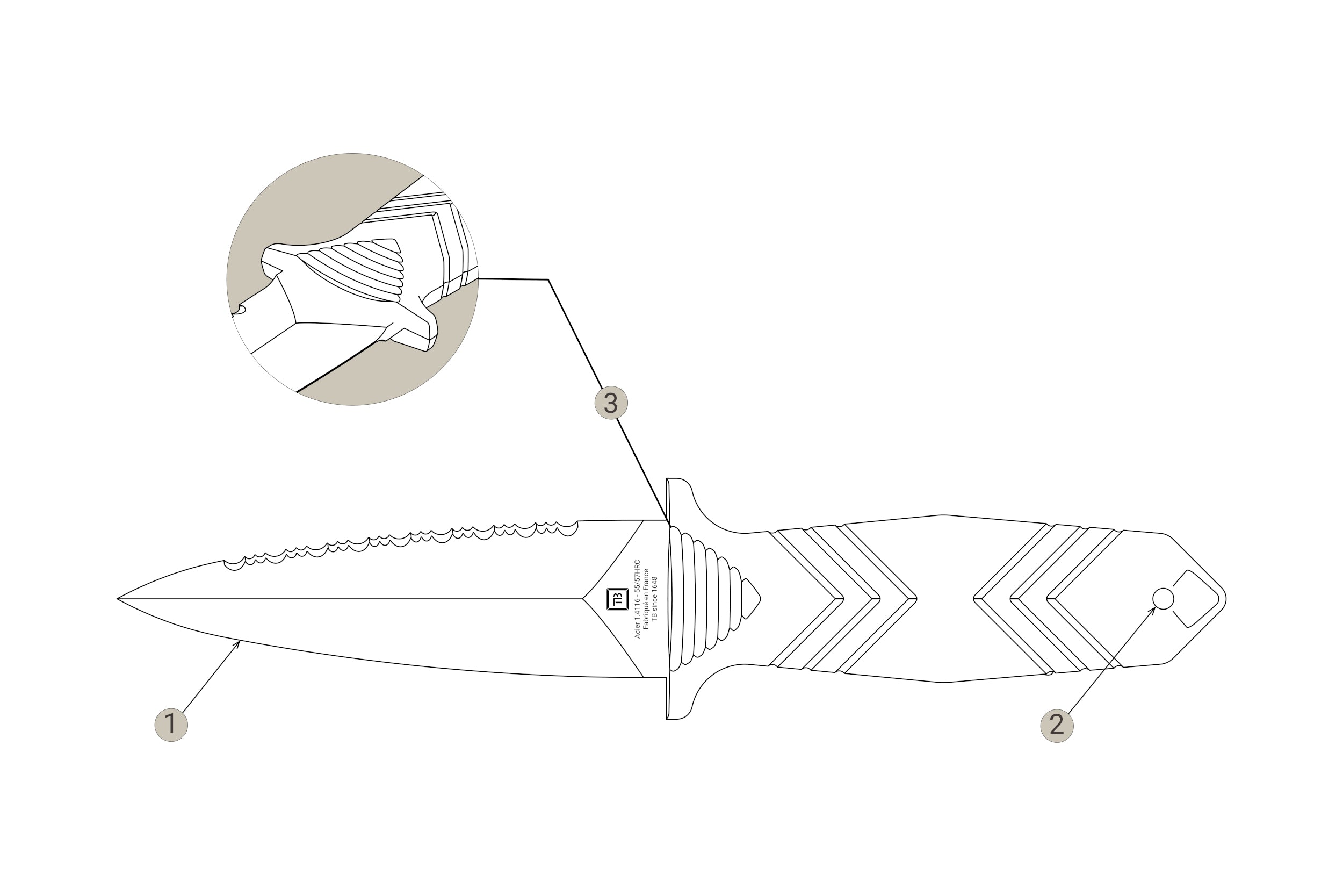 This dagger has a symmetrical double-edged blade (smooth & serrations). Its sharp and penetrating blade should allow a pilot to escape very quickly in an emergency situation. It cuts thick straps or cables (clamps) effectively and its penetration ability also allows it to work wonders in multiple situations.