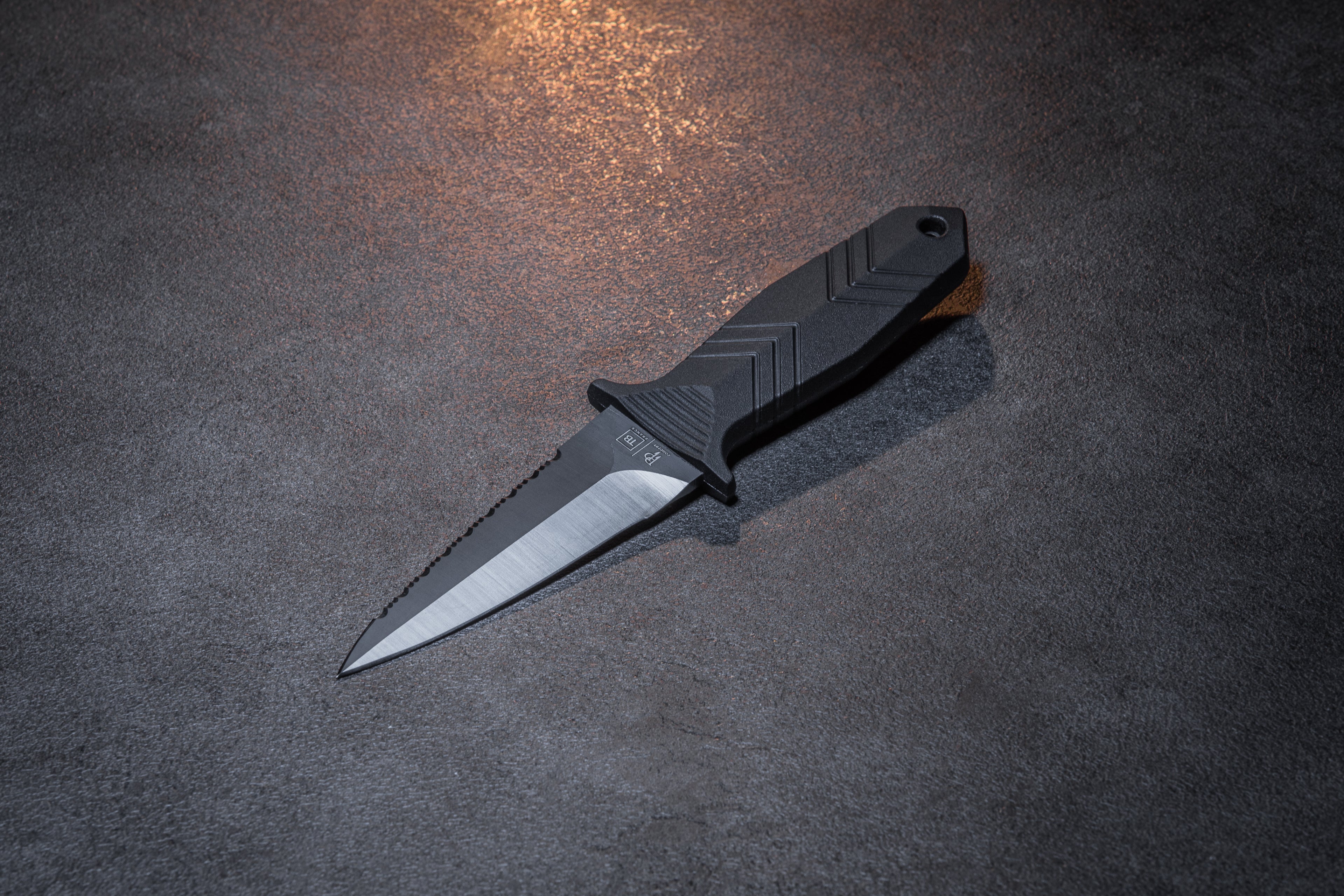Made up of a full-tang blade overmolded with fiberglass-filled polymer, its resistance is foolproof. The black color used on all components helps reduce the visual signature while giving it an aggressive aesthetic.