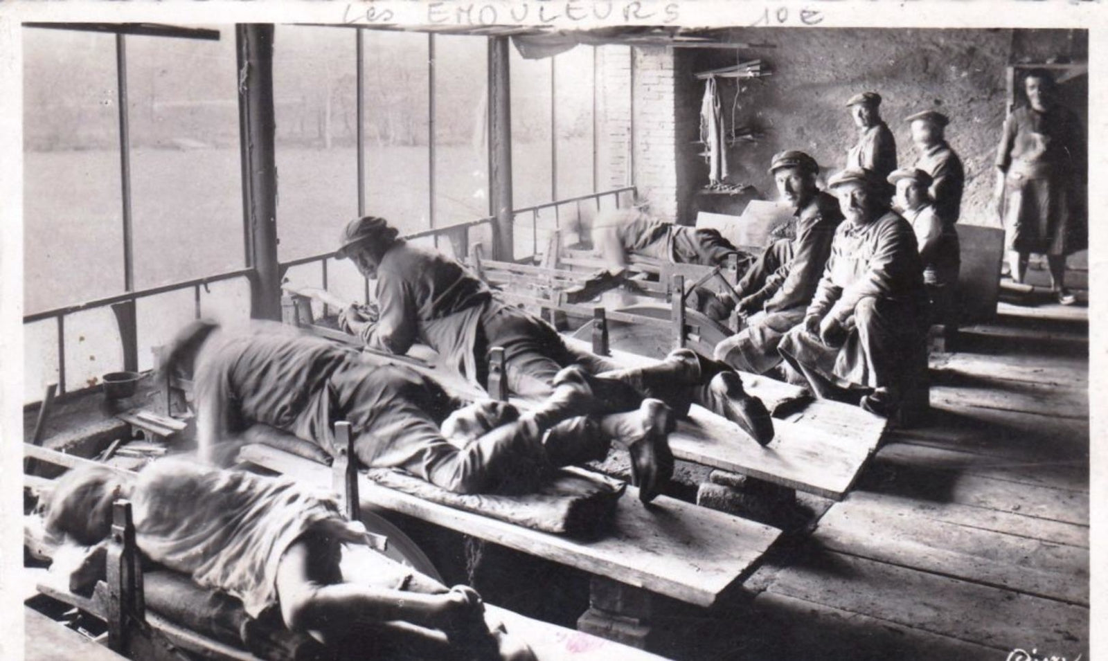 A cette époque, des photographes professionnels traversaient la France pour prendre des photographies des métiers traditionnels, des villes et villages, des sites touristiques pour en faire des cartes postales (principaux souvenirs de voyages à l'époque), c'est le plus ancien témoignage visuel que nous avons de notre histoire.Ce cliché a été pris en 1919 dans notre atelier (que l'on nommait un " rouet ") au village du Moulin Neuf, au bord de la rivière La Durolle (que l'on devine sous les arbres devant les fenêtres) Les "maîtres émouleurs", allongés sur des planches, effectuent à la main l'opération d'émouture c'est à dire la mise en biseau ( en " V ") des lames par frottement sur de grosses meules en pierres, à la force des bras, en s'aidant du poids du haut du corps. Les meules sont entraînées par l'énergie motrice de l'eau de la rivière.
