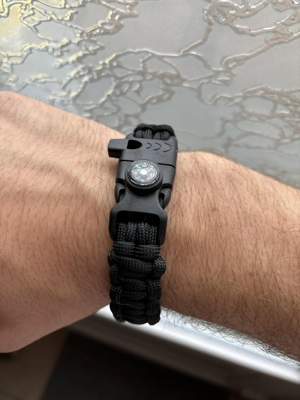 The paracord bracelet can help you, among other things, to: Replace a climbing rope; Repair equipment or clothing; Hang your gear up high; Make equipment; Build a raft; Design a trap. By unwinding the bracelet, you get 3 meters of paracord. The multifunctional clasp contains the following items: A firestarter and scraper, a compass, and a whistle.