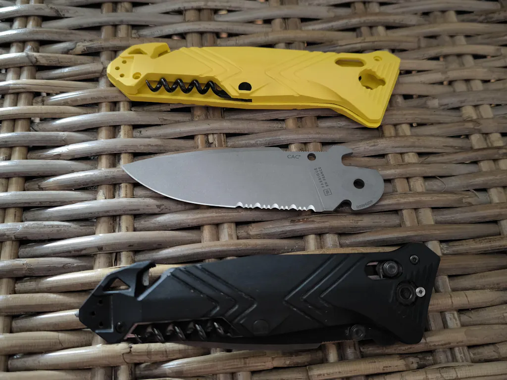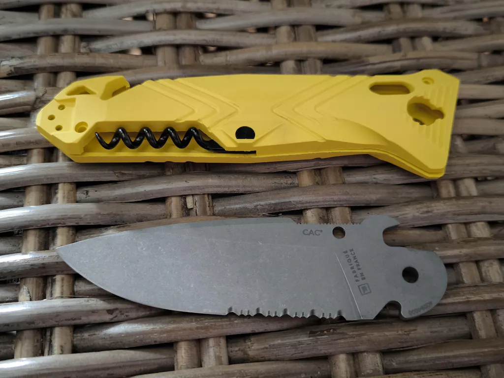 Les plaquettes de remplacement comportent un tire-bouchon ainsi qu'un coupe sangle. Le changement des plaquettes se fait de manière simple avec le kit d'entretien du couteau CAC.