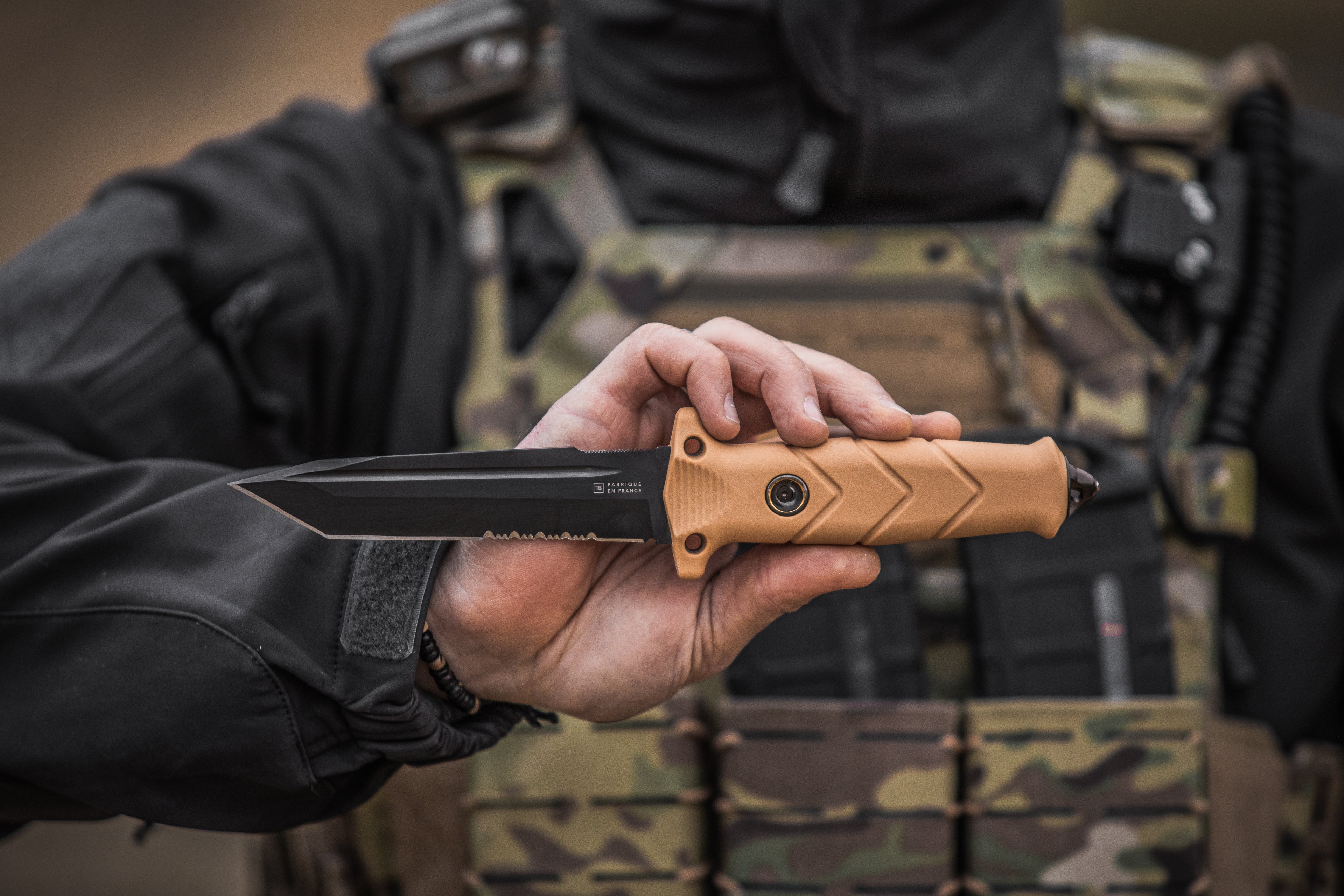 Les deux côtés du manche sont identifiables. Le décaissement qui permet le positionnement du pouce (pour le combat principalement) se voit attribué d’une texture différente selon le sens du couteau. Totalement pensé pour un port ambidextre, la sensation de la texture présente sur le décaissement permet à l’utilisateur de savoir dans quel sens est orienté le couteau même dans l'obscurité la plus totale.