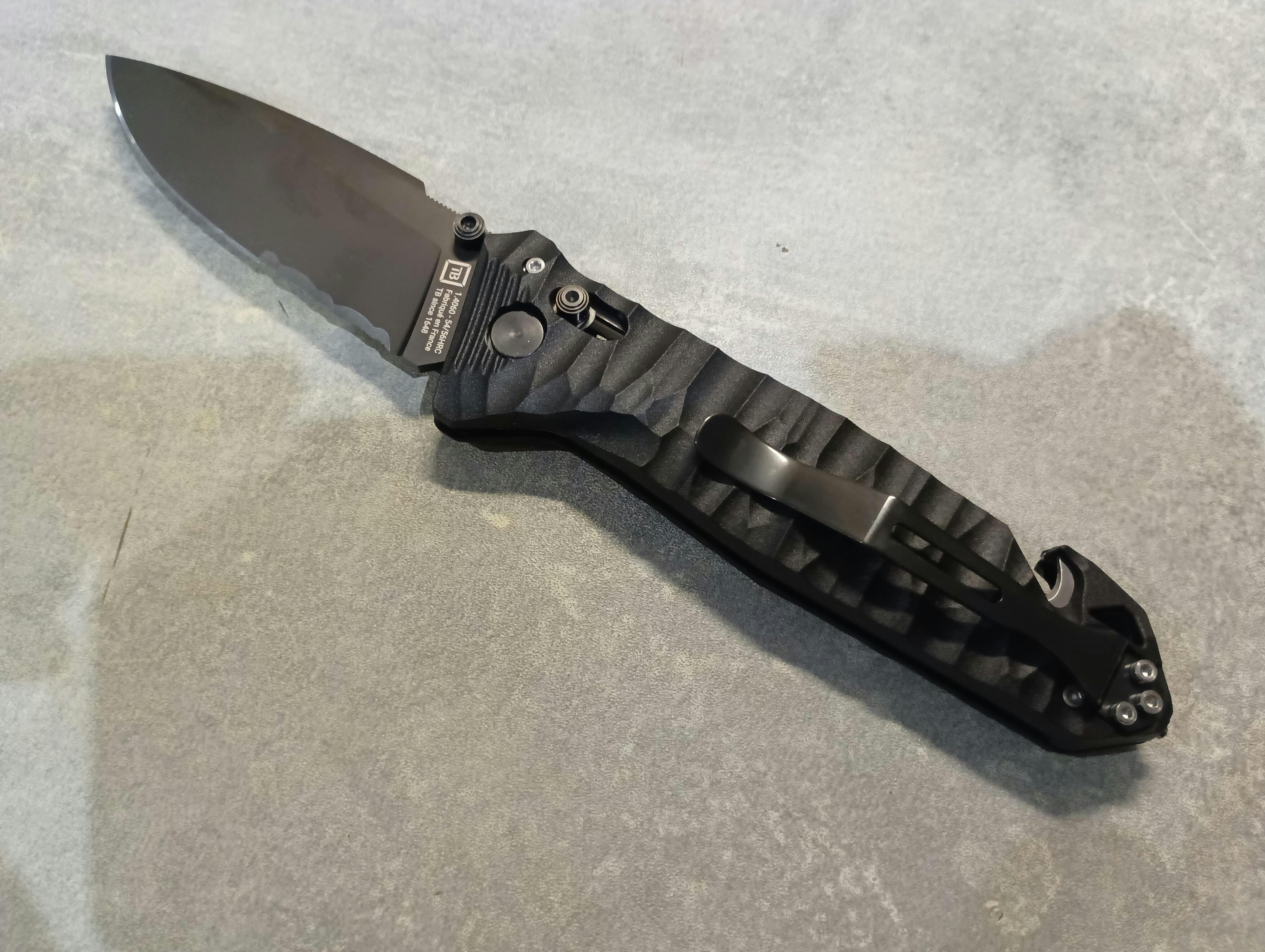 Le manche est constitué de deux plaquettes en polymère chargé de fibres de verre. Ces plaquettes sont vissées à la mécanique par des vis en acier inoxydable dont l'une d'elle loge astucieusement une lame coupe sangle. Cette lame courbe et interchangeable est conçue pour couper des sangles, des cordes et des ceintures de sécurité pour favoriser l'extraction en cas d'accident.